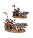 Droggz da Sunchompa leads his Snarlpack Cavalry, supported by Sunsteala Wheelas to conquer the Mortal Realms. Though small, this aggressive army gets the job done by being in the right place, at the right time. The Snarlpack ride two at a time, adding their spears to the Snarlfang's jaws to shred their opponents before bounding off for the next victim. The Sunsteala Wheelas cut down their quarry as they thunder past, stopping for nothing – the Gitz could not stop their Snarlfangs if they wanted to. Pinning it all together is Droggz da Sunchompa himself, sitting proudly atop Jaggedsnarl, his monstrous Snarlfang mount.