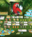 Anspruchsvolle Komponenten: Holz‑Meeples, 3D‑Baum‑ und Wasserlilien‑Elemente sowie ein Wasserfall.