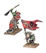 Orc Bosses are mighty leaders for Orc & Goblin Tribes. In this kit, you will find components to build two of these intimidating characters – one on foot and one mounted on a fierce War Boar. You get many options for your brutal Bosses, including a choice of great weapon, hand weapon and shield, spear and shield, or a pair of hand weapons. You can also build either Orc as a Battle Standard Bearer. There are also three head options and optional shoulder pads, allowing you to personalise your leader.
