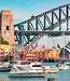 Cityscape of Sydney: Features famous landmarks like the Harbour Bridge and Opera House.