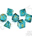 Diepblauwe sharp edge resin dobbelstenen met gouden flakes en cijfers voor elegante worpen met oceaanuitstraling. Lees meer..